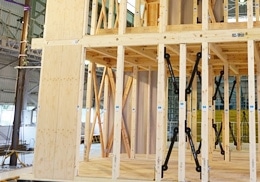このような従来からの耐力壁の最大の弱点を補うことで、構造を安定させることが出来ます。 早く(変形初期から)効いて且つ壊れない耐力壁、万が一耐力壁が損傷しても、建物が倒壊に至らないように長く粘る(非常に長い弾性域のある)耐力壁、そのような構造材を採用することによって、木構造の最適な設計が可能となります。